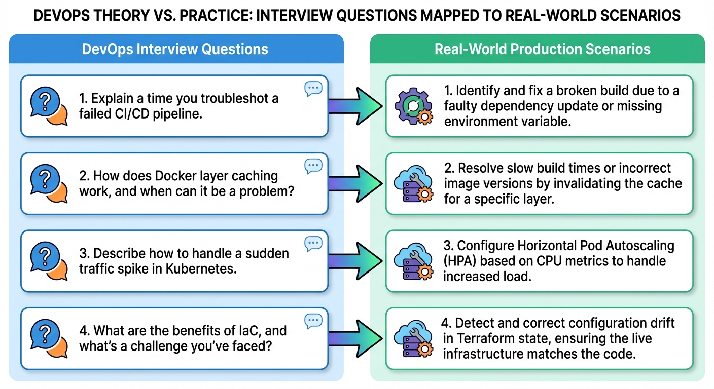 Draw heavily from your actual day-to-day grind. I told them: “Mornings? I’m usually triaging alerts in Prometheus, then running my Ansible 2.15 playbooks to catch config drift across 50 nodes. Afternoons? I’m reviewing PRs for Docker builds.” You don’t need to memorize anything if you can just explain your workflows end-to-end. Why did that pipeline flake out? Well, the image scan failed on a vulnerability in our Alpine base, so I fixed it with docker scan --accept-license and pushed it through.