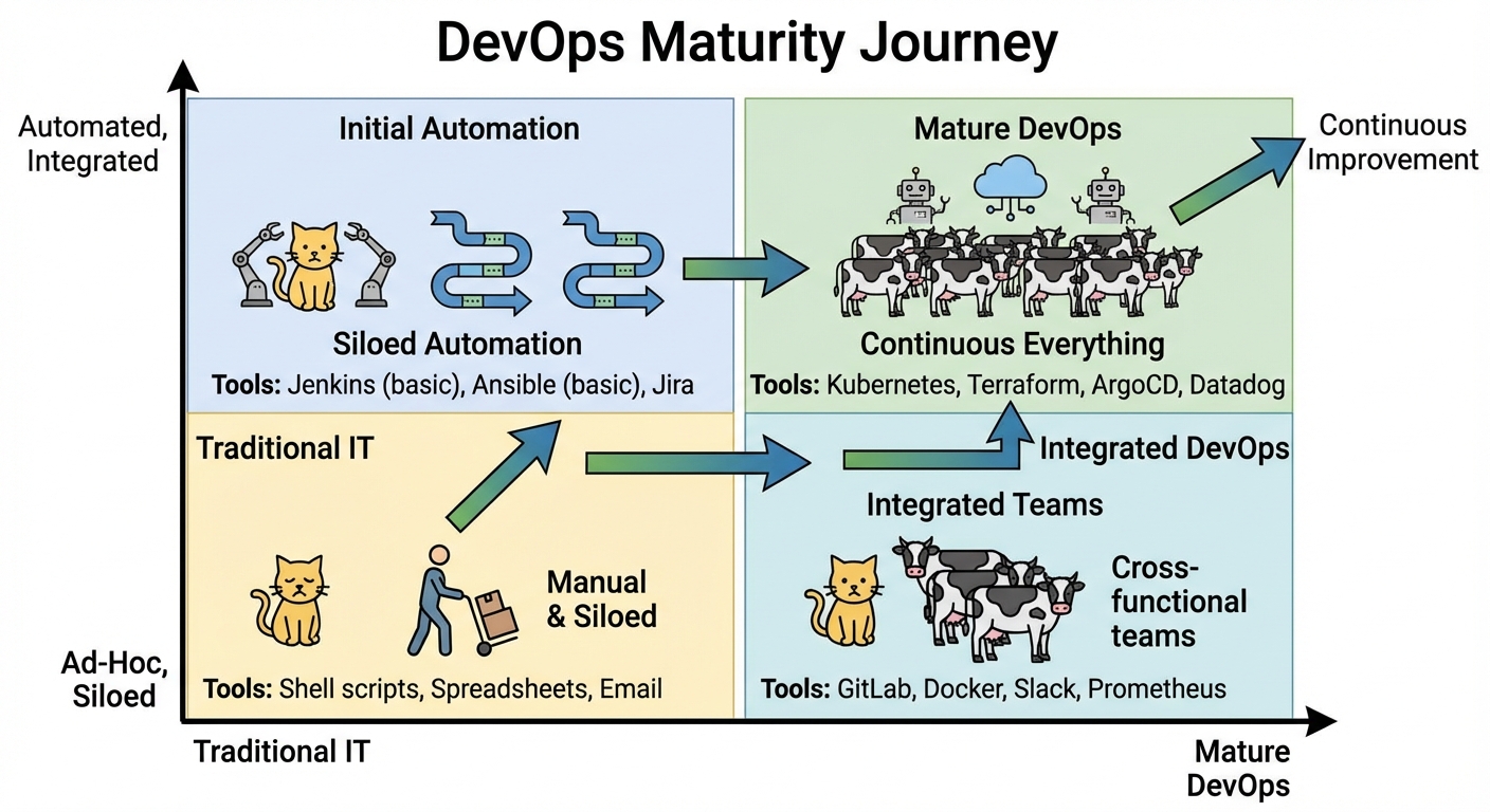 Traditional IT had drilled into me this idea of being super careful, methodical, and avoiding any chance of breaking stuff at all costs. DevOps turned that upside down completely. I had to wrap my head around the fact that breaking things in development could actually be a positive if it kept bigger messes out of production. Man, that mental switch was probably the toughest hurdle for me. I’m not entirely sure, but I think this mindset shift alone took me about three months to really internalize.